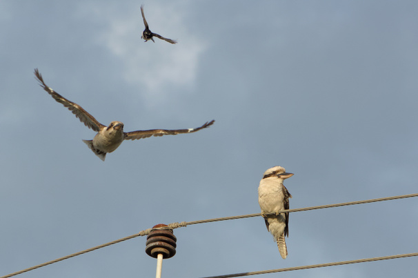 the magpie-lark can sometimes be mistaken for an australian magpie, and indeed they can both be found on short grass. but this species has a smaller body and beak, much lighter coloured iris, and completely black on the back of the head (no white).